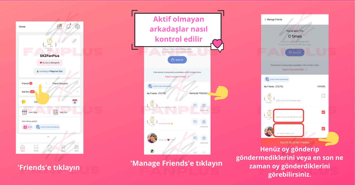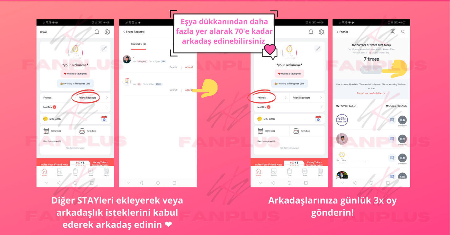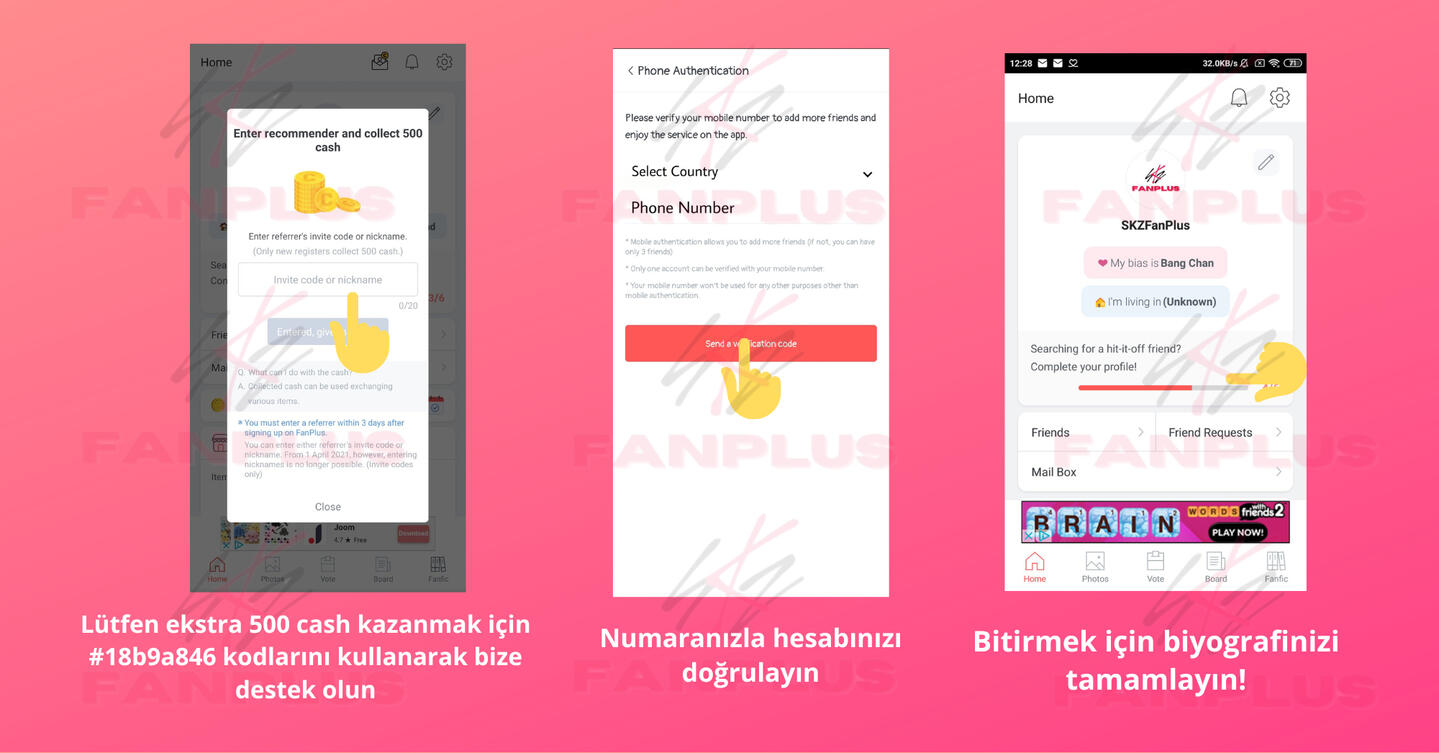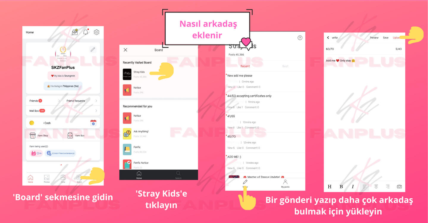 Arkadaş ekleyinSKZ Panosu üzerinden paylaşım yaparak daha fazla arkadaş edinin, böylece diğerleri sizi ekleyebilir!FanPlus sertifikanız için bir profil resmi ayarlayın böylece diğer STAYler güvenilir olduğunuzu bilir ve sizi eklemeye daha yatkın olurlar.